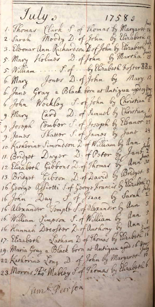Jane was baptized on the 6th of July and Maria on the 19th. The record contains information that they provided themselves, so we discover not just their ages (19 and 16 respectively) but also that they were from Antigua, where they likely acquired the surname Gray.[5]  The Gray family were well-known and influential on the island. Robert Gray’s will, dated 1754, stated that he owned and leased several plantations across the island, including one bought from John King in Belfast Division, possibly the same plantation later referred to as Gray’s Belfast.[6]