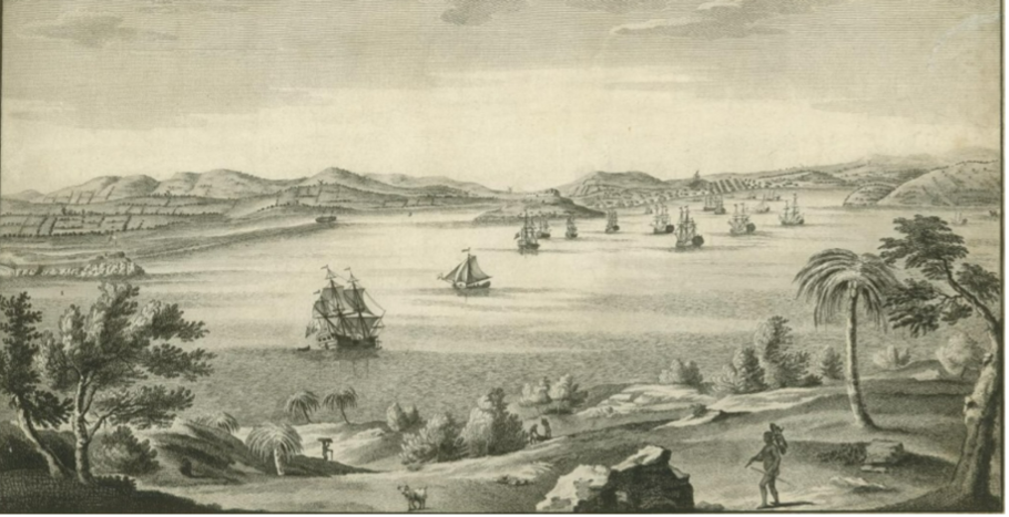 A black and white illustration of a Caribbean harbor, featuring a number of sailing ships