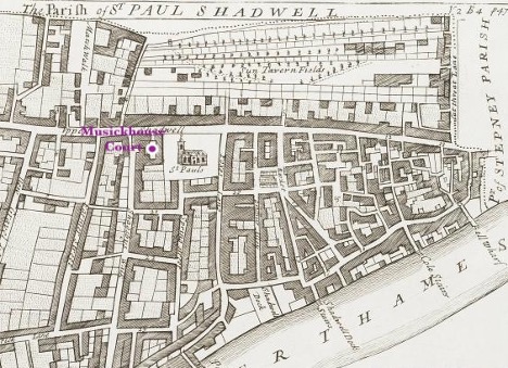 A black and white map of the London neighborhood of Shadwell, with streets labeled and a marker noting the location of Musickhouse Court